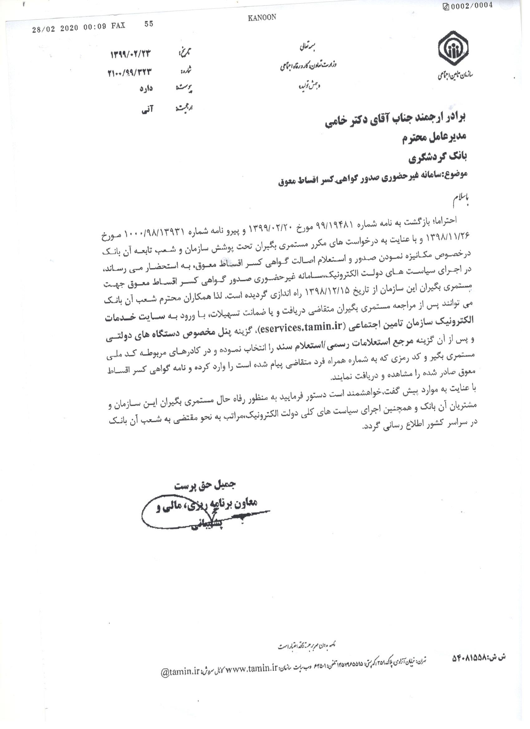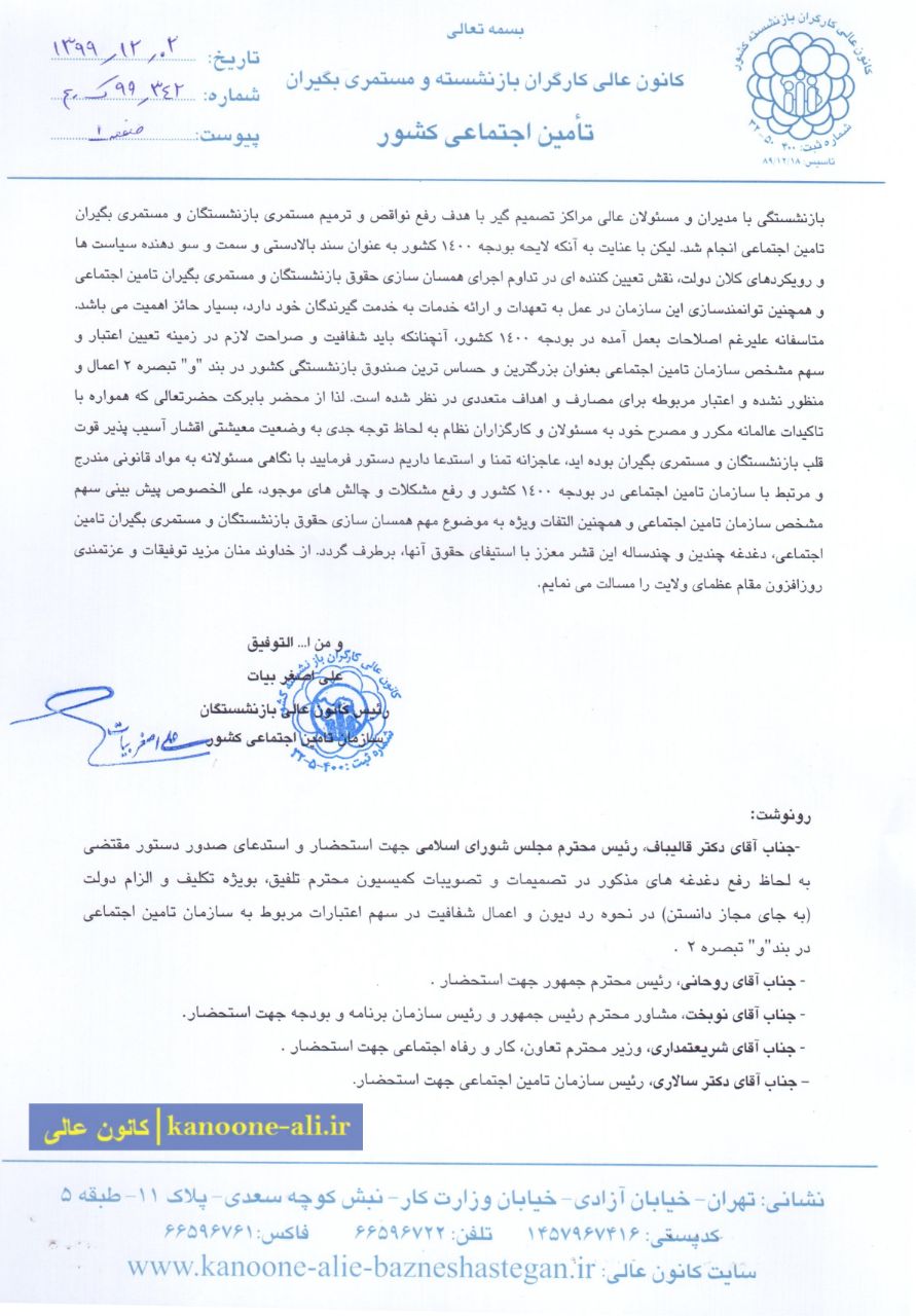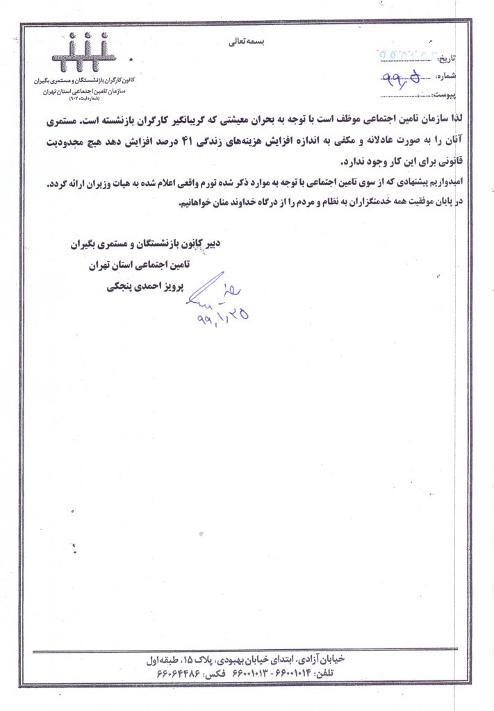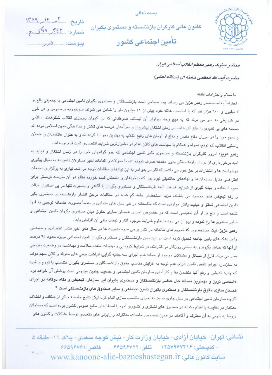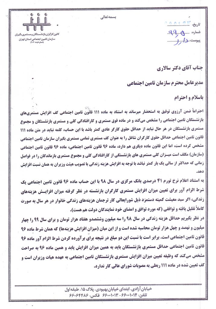 نامه کانون بازنشستگان و مستمری بگیران تامین اجتماعی استان تهران به مدیرعامل سازمان تامین اجتماعی برای افزایش مستمری بازنشستگان