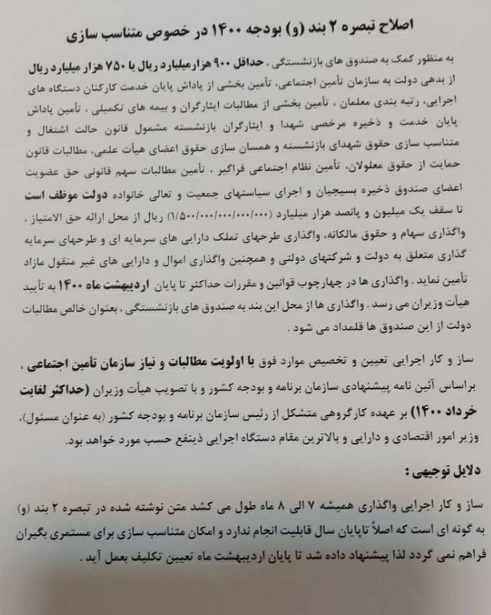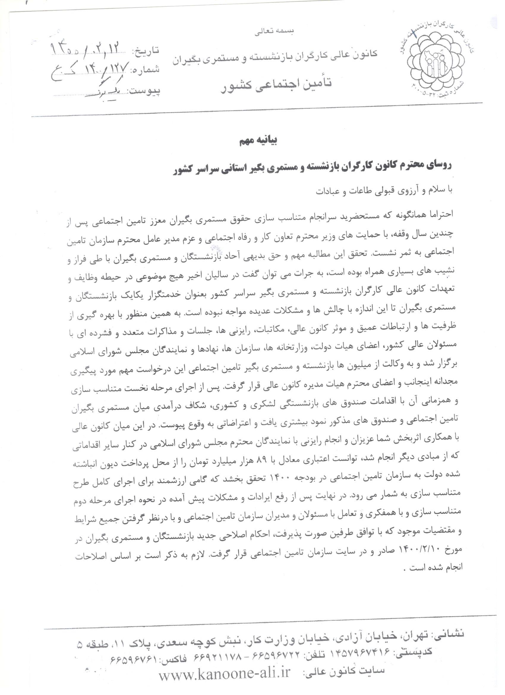 احتراما با عنایت به اهمیت وافر و روز افزون موضوع متناسب سازی حقوق بعنوان مهمترین مطالبه بازنشستگان و مستمری بگیران تامین اجتماعی، نظر به ضرورت اصلاح تبصره ۲ بند "و" بودجه ۱۴۰۰ کل کشور و پیش بینی اعتبار مناسب، شفاف، با لحاظ اولویت و تسریع در رفع تبعیض ها، کاستی ها و دغدغه های برحق مستمری بگیر تامین اجتماعی، ضروری است کلیه روسای محترم کانون های بازنشستگی استانی و شهرستانی سراسر کشور با بهره مندی از ظرفیت چانه زنی، تعامل و ارتباط سازنده با نمایندگان محترم مجلس شورای اسلامی در حوزه های انتخابیه نسبت به تبیین، تشریح و آگاهی رسانی متن اصلاحی تبصره ۲ بند "و" بودجه ۱۴۰۰ درخصوص متناسب سازی به شرح تصویر پیوست اقدام جدی و فوری بعمل آورند.