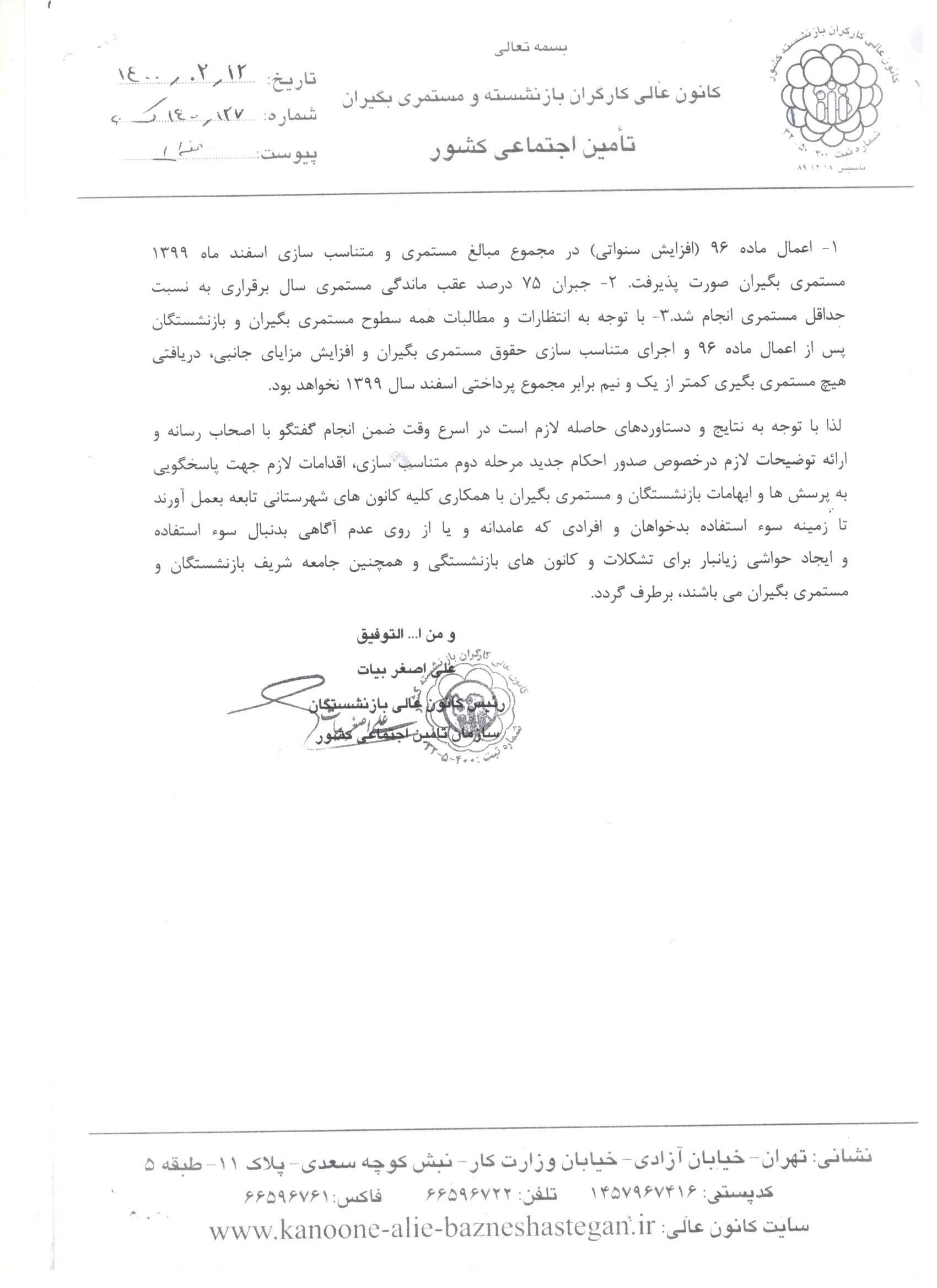 ضمناً افزایش سایر سطوح برای بازنشستگان بر اساس عدالت و سوابق بیمه پردازی نبوده وخواستار افزایش حقوق ها بر اساس سوابق بیمه پردازی می باشیم و براساس ماده ۹۶ قانون تامین اجتماعی و افزایش سرسام آور قیمت ها برای نیمه دوم سال ۹۹ خواستار تجدید نظر و افزایش حقوق بازنشستگان هستیم