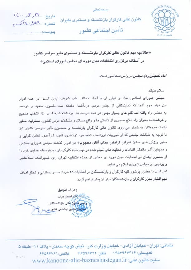 کانون کارگران بازنشسته و مستمری بگیران تامین اجتماعی تهران همیشه حمایت خود را از سازمان تامین اجتماعی و استقلال مالی و اداری این سازمان اعلام کرده و از دولتمردان و نمایندگان مجلس شورای اسلامی خواستار عدم دخالتهای غیر اصولی و دست اندازی به اموال و دارائی بیمه شدگان و بازنشستگان می باشد و با توجه به اینکه نمایندگان مجلس شورای اسلامی همواره باید حامی حقوق ملت مخصوصاً اقشار ضعیف جامعه باشند بارها نمایندگان کانون عالی بازنشستگان کشور به اتفاق نمایندگان تهران برای تصویب اصلاح ساختار تامین اجتماعی جلسات متعددی گذاشته و برای تصویب این طرح که از سوی شرکاء اجتماعی تهیه شده فقط و فقط حرف میزنند وهیچ حرکت عملی از ایشان حادث نمی شود رأی دادن در دوره بعدی به این نمایندگان خیانت است. تصویب قوانین غیرکارشناسی در ادوار گذشته تاکنون بی توجهی به خواسته های بحق کارگران و بازنشستگان در مجلس شورای اسلامی بوده است. شما نمایندگان مجلس با رأی همین کارگران و بازنشستگان و بیمه شدگان راهی مجلس شورای اسلامی شدید و شعارهای انتخابی حمایت از محرومین در هنگام انتخابات گوش فلک را کر میکند. این روا نیست که مشکلات کشور و فشارها و هجمه ها را به سوی سازمان تامین اجتماعی که ارائه دهنده خدمات موثر است بنمائید اکثریت مصوبات مجلس در تعارض بر حمایت از کارگران و بیمه شدگان و بازنشستگان بوده ، گرفتاری ها و مشکلات کشور را نباید کارگران و بازنشستگان حل کنند.