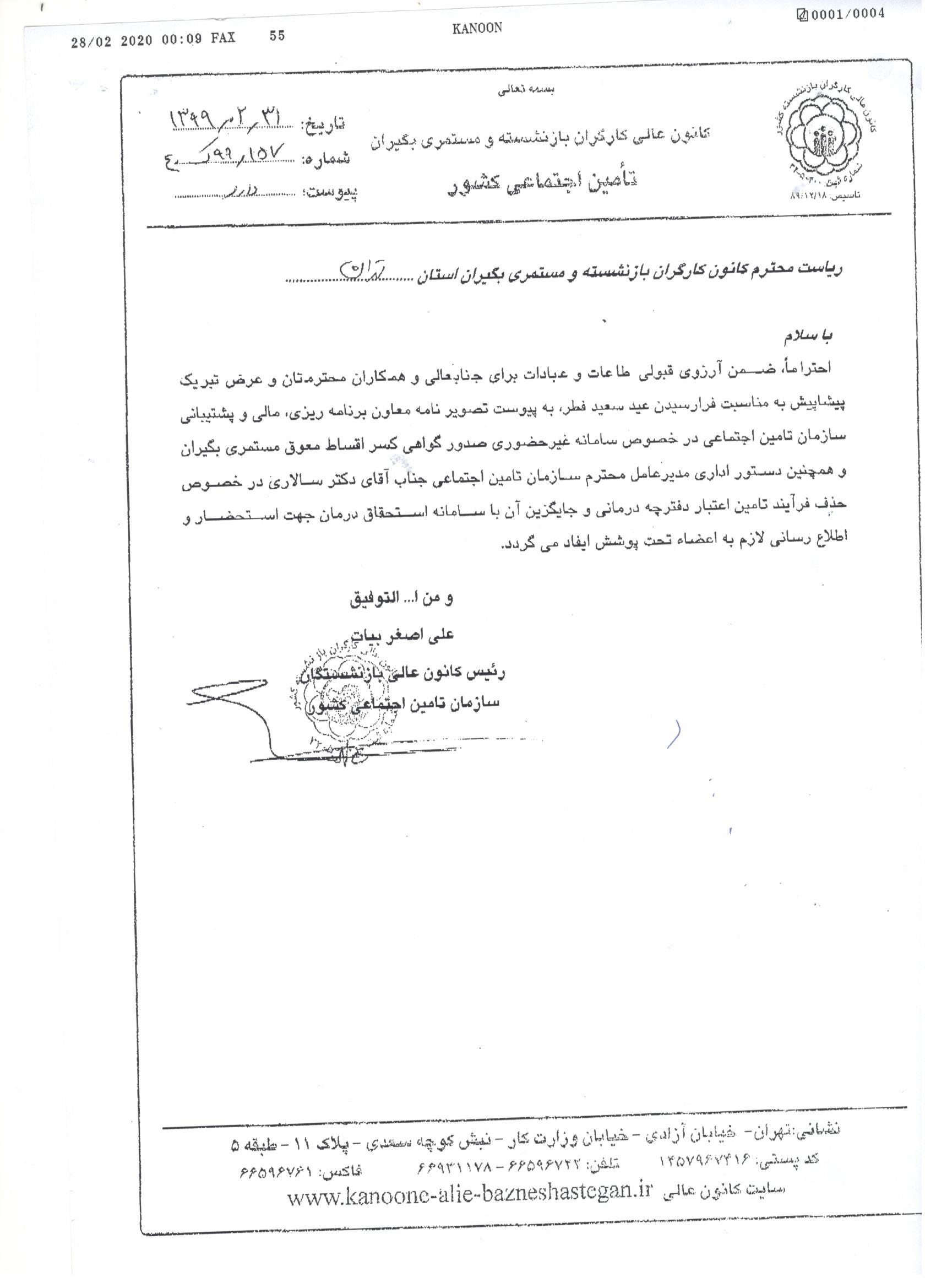 پیشاپیش از همکاری همه بازنشستگان و کانون های بازنشستگان شهرستانهای استان تهران سپاسگزارم