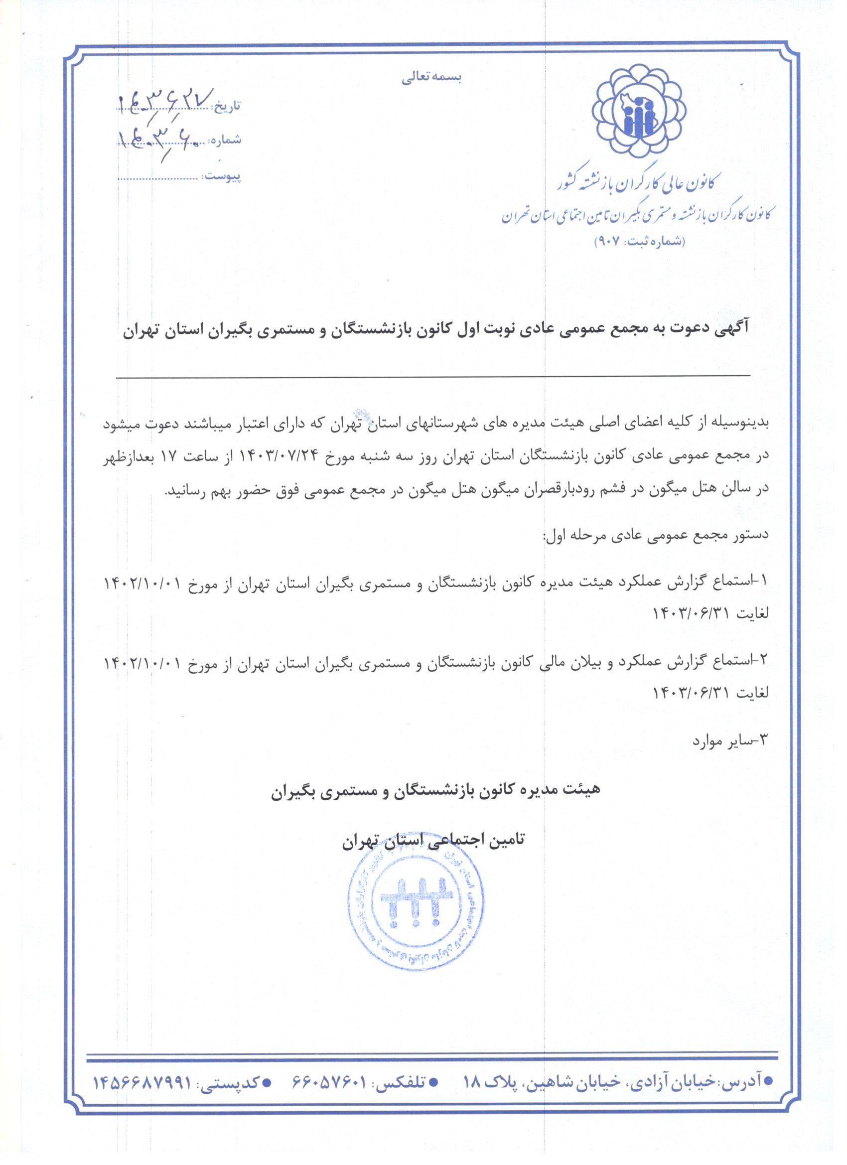 آگهی دعوت به مجمع عمومی عادی نوبت اول کانون استان تهران