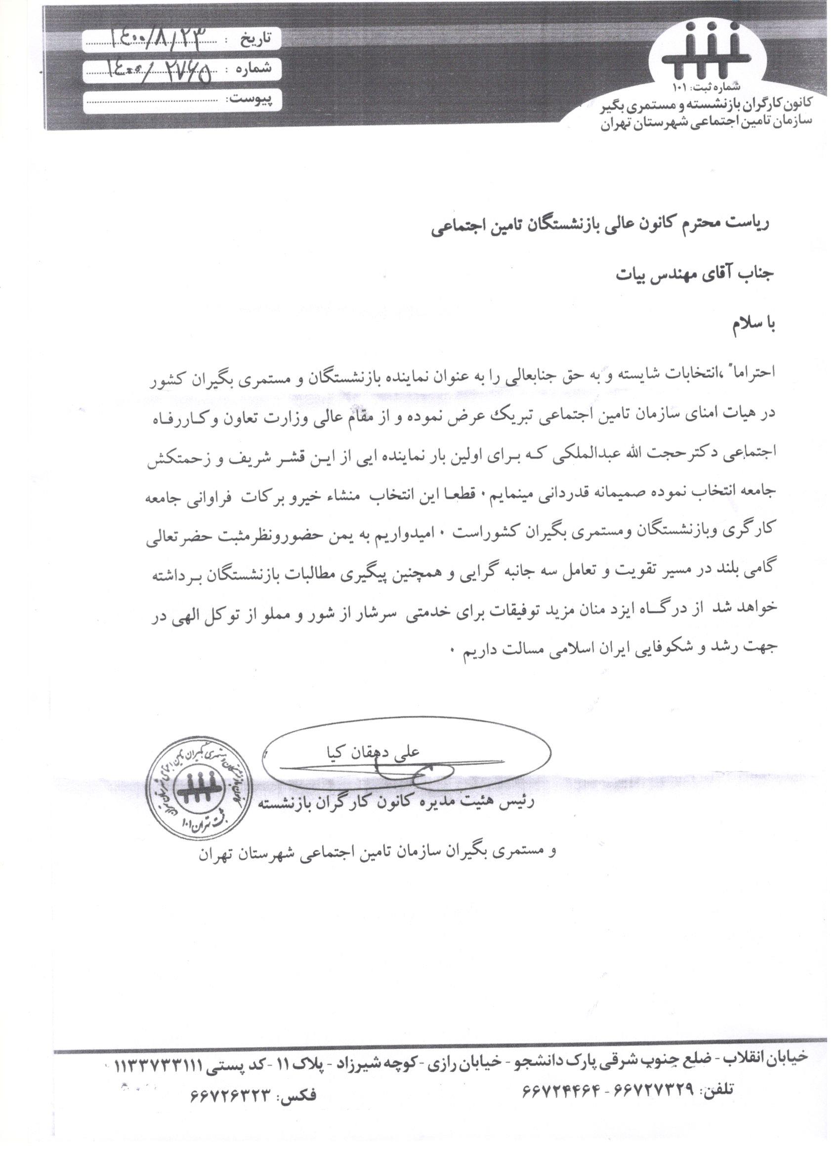 ریاست محترم کانون عالی بازنشستگان تامین اجتماعی جناب آقای بیات انتخاب شایسته و به حق جنابعالی را بعنوان نماینده بازنشستگان و مستمری بگیران کشور در هیات امنای سازمان تامین اجتماعی را تبریک عرض نموده و توفیقات روزافزون از درگاه ایزدمنان برای خدمت سرشار از شور و توکل الهی درجهت رشد و شکوفایی خواستاریم . مهدی حسین رئیس کانون بازنشستگان استان تهران