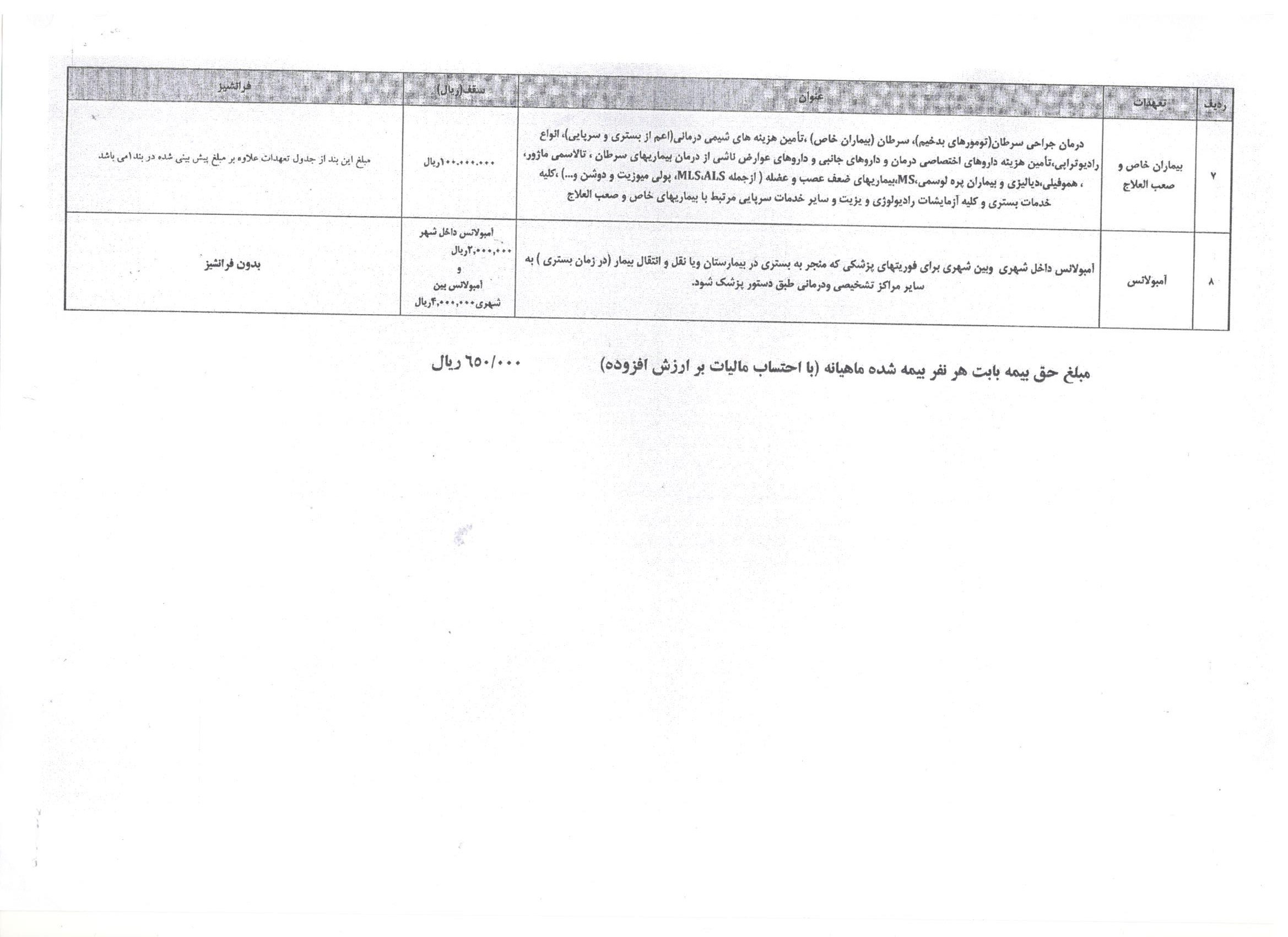 ۶- خواستار حذف دو درصد از بابت درمان که توسط تأمین اجتماعی ماهیانه از حقوق و مستمری بازنشستگان کسر می گردد و به جهت پرداخت اضافه بابت درمان از جیب بازنشستگان و مستمری بگیران به بیمه تکمیلی صورت می گردد را میباشیم.